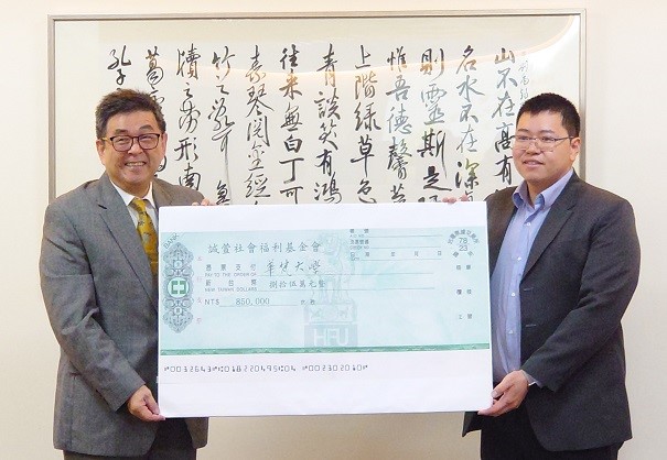 由誠萱社會福利基金會黃思源董事代表捐贈85萬元給華梵大學。校長李天任感恩表示,將以此為基礎設立專戶、專款專